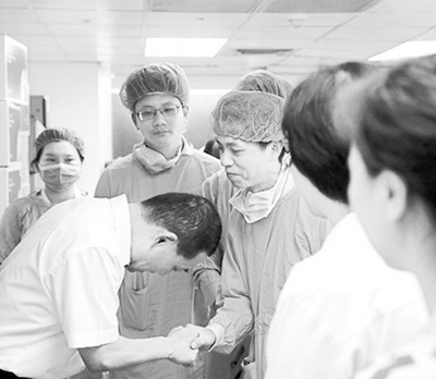新台市副市长侯友宜(左)慰问医护。图片来源:台湾《联合报》