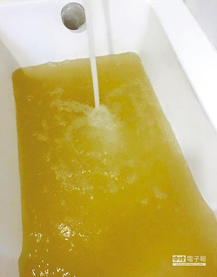 台北市议员王鸿薇家中的自来水,在11日晚上11:30分仍呈现黄浊色。图:台湾“中时电子报”