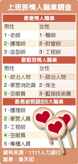 台湾1111人力银行公布上班族最爱及最厌恶情人职业调查,不论男生女生最不想交往的对象都是政治人物。图自台湾“中时电子报”