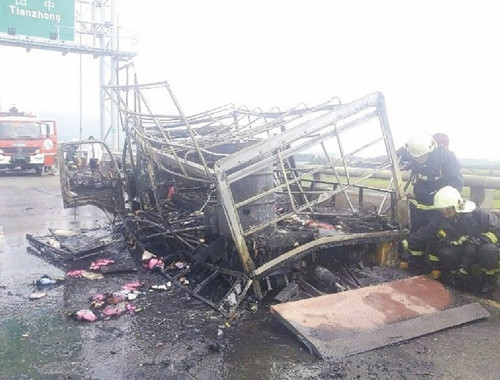 萧男说,他行驶到八卦山隧道前的林厝交流道附近,从后视镜惊见后车篷窜出熊熊火焰,他和助手冲下车,因车上没有灭火设备,消防局到场迅速扑灭火势,但整辆车仍在半小时被烧成骨架。
