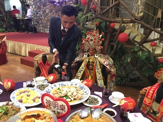 据台湾《联合报》报道,台北花卉村昨晚有场特别的婚礼,新人请来20尊神像当见证,还为众神准备2桌“酒席”。