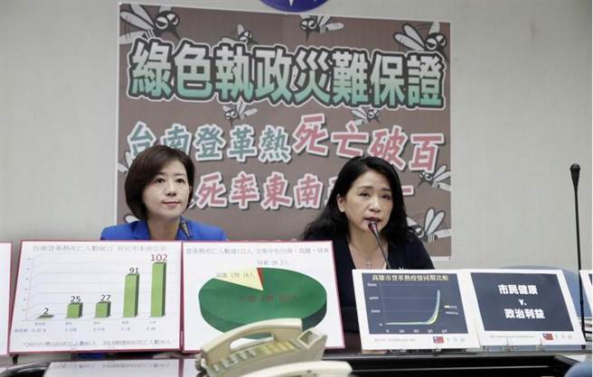国民党“立委”王育敏(左起)、李贵敏21日举行记者会,抨击台南市登革热死亡病例已经破百,并质疑绿色执政在南台湾是登革热梦魇。(中时电子报 姚志平摄)