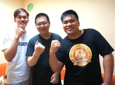 在八仙尘爆受伤的赖政楙(左起)、小胖、大仁,鼓励其他伤者不要放弃,乐观面对复健之路。(图取自台媒)
