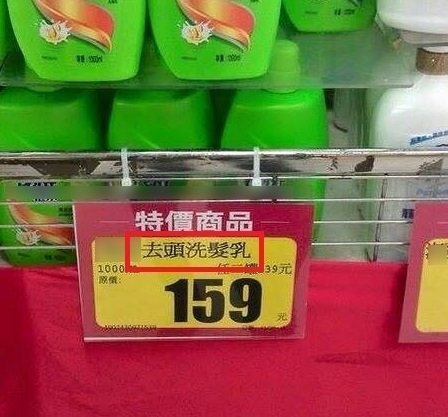 据台湾“联合新闻网”报道,一名网友在某间超市购物时,逛到洗发精区时仔细一看,发现某牌洗发精标价牌子上竟写“去头洗发乳”,让网友愣了片刻。