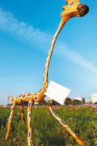 漂流木制的长颈鹿矗立在花海中相当醒目,但背上一排刺也显得突兀。来源:台湾《联合报》
