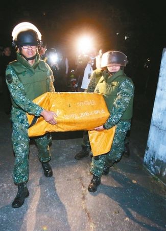 台军方派人带走水泥块调查。来源:台湾《联合报》