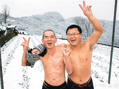 面对罕见雪景,有民众脱衣狂欢,感受难得一遇的低温。