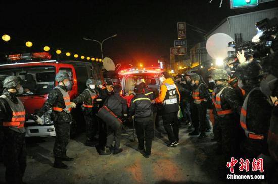 2月6日淩晨3时57分许,台湾高雄发生里氏规模6.4级地震。台南市永康区维冠金龙大楼倒塌,当晚,搜救工作持续进行,搜救队在黑夜中不放弃任何一丝希望。图为晚上9时15分左右,有伤者从倒塌大楼中救出。中新社记者 谭达明 摄