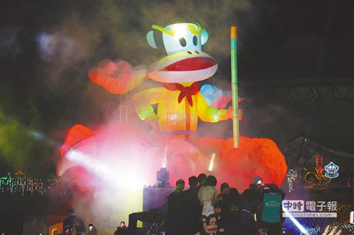 “旋转大嘴猴”今晚将在台中公园压轴开灯,以脚踩筋斗云的霸气姿态现身,搭配360度旋转及七彩灯光特效,犹如猴跃星空,意寓“立足台中、放眼国际”。