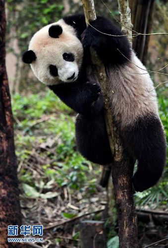 大熊猫“圆仔”在爬树。新华社记者 张国俊 摄