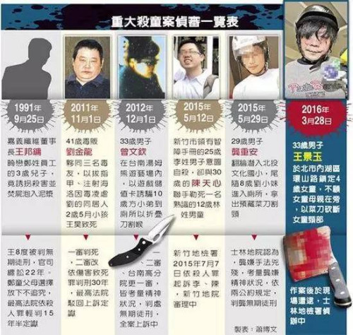 4岁女童惨遭割喉断颈,令台湾各界震惊、愤怒与恐惧。警方将嫌犯王景玉从派出所转押至内湖分局时,很多民众对嫌犯骂脏话喊打。更有不少民众闻讯赶来,警方虽出动大批警察维持秩序,仍难敌民众愤怒挥拳发泄,但嫌犯竟然面露凶狠冷酷的表情,大喊“不要再打了!”嫌犯脸上还残留着女童的鲜血,斜眼看着围堵的民众和媒体,丝毫没有悔意。目前警方还在进一步了解嫌犯的行凶动机。 杀童嫌犯王景玉出身眷村,父亲原籍四川,是空军退役老兵,多年前从航空公司退休,一家人鲜少和邻居互动。王是独子,退伍后就业不顺,曾在大卖场发海报打工,后来没有工作,全靠父亲的退休金和老妈当清洁工养他,是个“不折不扣的啃老族”。邻居得知他杀害女童,气着直骂他一直是“小区头痛人物”,还指着警卫亭遭毁损的痕迹,“这就是他踢坏的!”