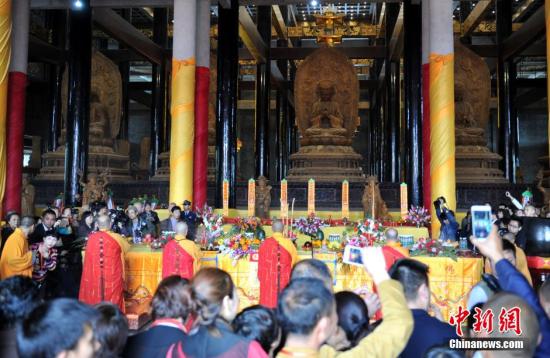 4月12日,僧众举行仪式迎接佛骨舍利回石象寺。当日,成都蒲江县石象寺举行法会,恭请释迦摩尼佛佛骨真身舍利回寺,该舍利是从台湾慈法禅寺恭请回,将在石象寺永久供奉。佛陀舍利是指佛陀火化后的遗物,极为罕有。 中新社记者 刘忠俊 摄