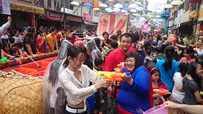 新北市泼水节今天在新北中和区华新街登场,民众拿起水枪大打水仗,玩得不亦乐乎。(图片来源:台湾“中时电子报”)