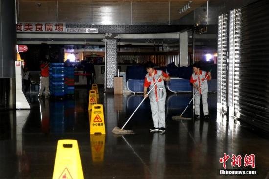 6月3日,台湾桃园机场地下二层摆放着多个防滑提示牌,清洁工持续清洗地板。桃园机场及周边2日遭遇强降雨,据机场地下二层商铺老板介绍,水一度淹到仓库内约半米高。 中新社记者 陈小愿 摄