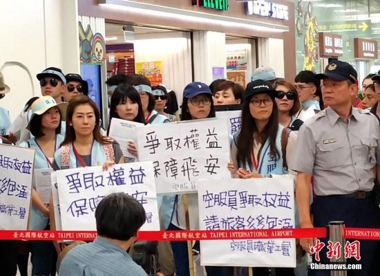 6月24日,以台湾中华航空公司空服员为主的桃园市空服员职业工会于凌晨起罢工。当日上午6时到晚上10时,桃园机场及松山机场出发共67班航班全部取消,受影响旅客约2万多人。图为罢工代表在松山机场打出“空服员争取权益,请旅客多多包涵”等标语,向乘客解释情况,请大众理解并支持罢工。 中新社记者 邢利宇 摄