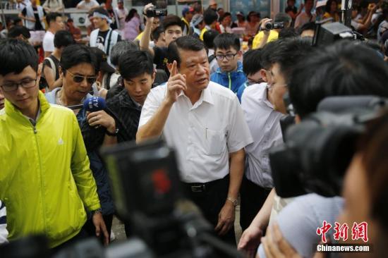 6月24日下午,台湾中华航空公司新任董事长何煖轩抵达华航台北分公司外,与罢工的空服员对话。他在现场表示,同意空服员回到松山机场报到的要求,至于工会提出的其他6项诉求,则由工会代表与华航高层等进行协商。中新社记者 陈小愿 摄