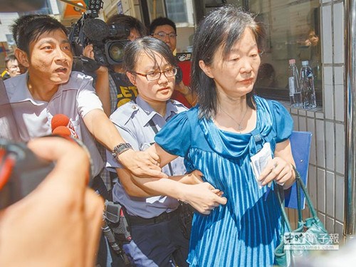 “乐活老人长期照顾中心”负责人井宝琳(右)在接受媒体采访后,随即被带往派出所侦讯,讯后请回。(台湾《中国时报》/杜宜谙 摄)