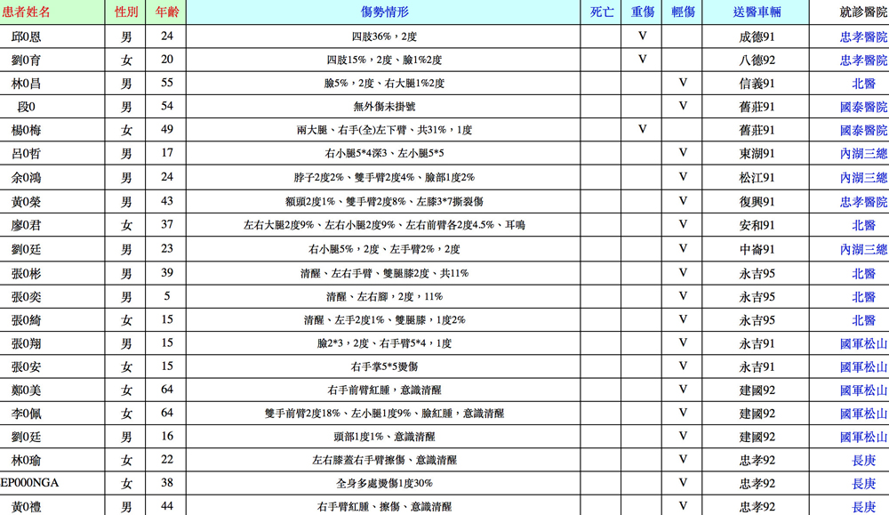 据台湾东森新闻云报道,共有21人受到轻重不等的灼伤。根据台北市消防局统计,21名受伤者分别被有3人被送往内湖三总医院、2人送到忠孝医院、6人送至北医、5人到松山台军医院、2人到国泰医院、3人至台北长庚医院。伤者除撕裂伤、吸入性呛伤外,还有部分伤员因受面积不等的1至3度灼伤,被送往加护病房治疗,其中北医就占了3位。