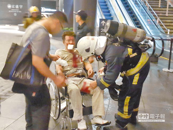 图为爆炸发生后,嫌犯肺部及腿部受伤,救护人员协助坐轮椅送医。(台媒图)