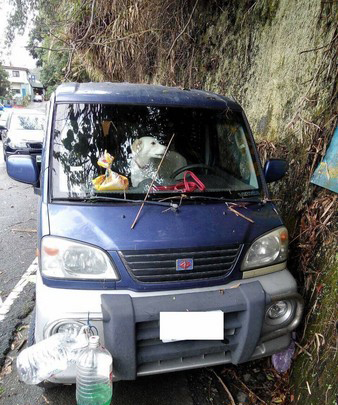 嫌犯将车就停在偏僻的山边,并将与之四处流浪的爱犬留在车上,保险杆上也挂着一桶汽油。(图片来源:台湾东森新闻云)