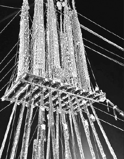 “抢孤”由孤柱、孤棚、孤栈组成。孤柱有16根,每根都是笔直矗立的大杉木,中间12根涂满了牛油供竞赛队伍攀爬,外围未涂牛油的4根供“好兄弟”爬(注:“好兄弟”是台湾地区对孤魂野鬼的委婉说法)。可别小看了这12根孤柱,爬起来可真要命,牛油使得柱子表面摩擦近无、光滑无比,传统的攀爬方式肯定行不通。不过选手们也有土办法,先是在柱子表面洒满冥纸增大摩擦,接着用叠罗汉的方式堆起高人塔,地面上的队友们使出吃奶的劲儿把队友往上推。到达一定高度后,就是单兵作战了,负责攻顶的选手先用布条一层层刮去牛油,再把布条绑在柱子上,以此为支力点,一步一个脚印地往上“蠕动”。