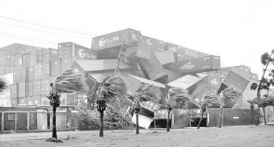 图为“莫兰蒂”强台风横扫高雄,高雄港码头边堆置的数十个货柜,被强风吹得东倒西歪。(图片来自联合报)