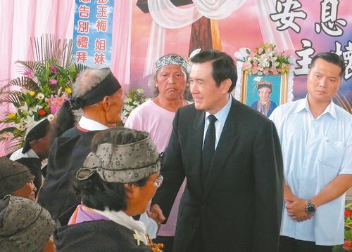 马英九9月19日南下参加鲁凯族人瑞彭玉梅阿嬷告别式,表达感念和敬佩。台湾《联合报》记者萧雅娟/摄影