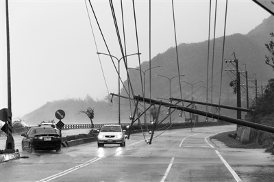 “莫兰蒂”台风天,电线杆被大风吹倒,造成大停电。