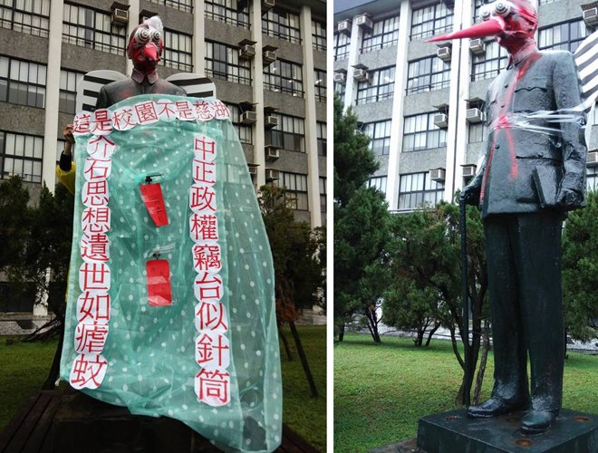 台湾辅仁大学的蒋介石铜像被装上翅膀、蚊帐。