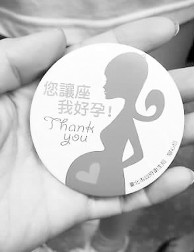 台北捷运自2007年9月起发行“博爱识别贴纸”,有需求者可到各车站询问处索取。2010年起台北市也制作“好孕胸章”,提供准妈妈在搭乘大众交通运输工具时佩戴,提醒民众看到能主动让座。(资料图片)