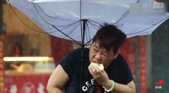台大妈台风天吃包子照爆红 雨伞"开花"照吃不误