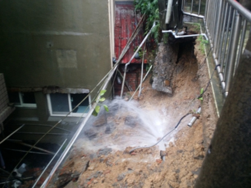 这一起土石流失,地基被掏空案件,有自来水管破裂,大水流入民宅,现场黄泥水滚滚,危及多户房屋结构,消防人员已到场警戒,疏散住户,并且通知自来水公司、瓦斯公司前往处理。