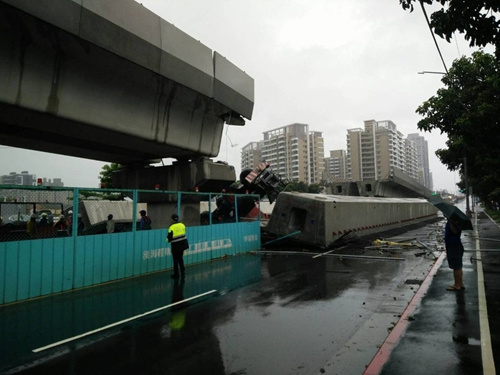 据台湾联合新闻网报道,新北市淡水区中山北路三段与滨海路一段交叉路口,正在施作的淡水捷运轻轨工程,传出正在吊挂的轨道掉落,现场有一台吊车跟轨道一起翻落地面,男性吊车司机受伤,但目前意识清醒,警消赶往抢救中。(记者祁容玉)