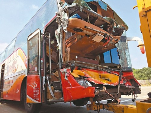前方被追撞的游览车郭姓司机表示,他从梅山往水上初中要接学生到民雄表演艺术中心,进兰潭隧道, 前方自小客减慢速度,幸保持安全车距才未撞上,但没想到“碰!”一声,被后车追撞。(记者鲁永明、黄煌权、黄寅、邵心杰)