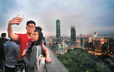 台湾公布的最新数据显示,大陆赴台游客数量继9月份同比下降近四成后,10月份扩大为同比下降44.3%。图为游客在观赏台北夜景。