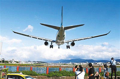图为部分游客和市民在台北松山机场附近观看飞机降落。新华社记者 朱 祥摄