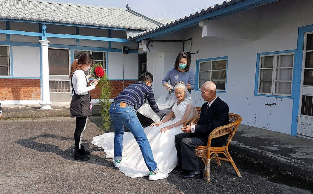 据台湾媒体报道,嘉义县太保市公所为举办市长就职2周年及“幸福太保 感恩有你”金婚楷模表扬活动,今天为辖区14对金婚夫妻定装、拍摄婚纱照。86岁阿嬷抗拒穿白纱,并表示62年前就结婚了,现在这么老还拍婚纱照,“你会害我被人笑!”