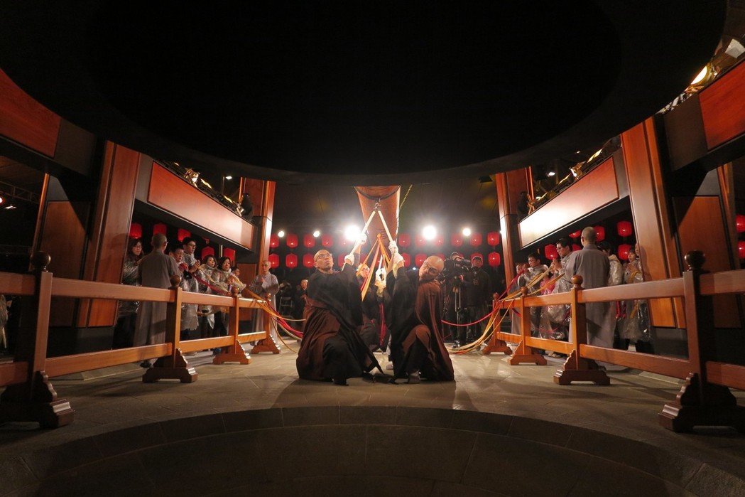 法鼓山连续11年举办撞钟祈福法会,4名法师奋力撞响108响法华钟声。(图片来源:台湾《联合报》)