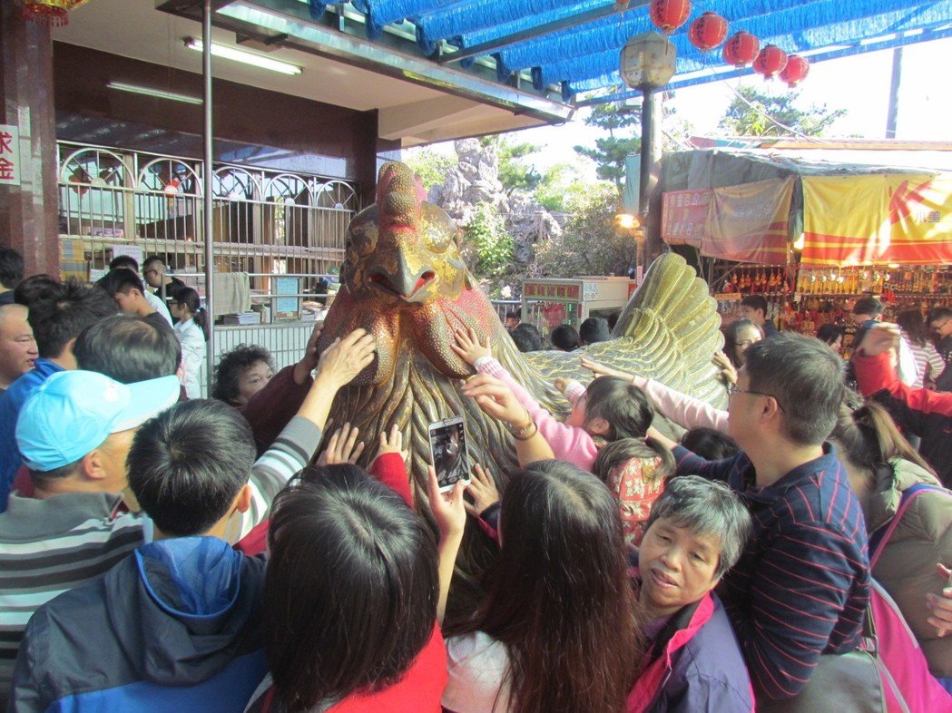 金鸡是紫南宫的吉祥物,紫南宫借金处前的金鸡,挤满了大批信众。(图片来源:台湾《联合报》)