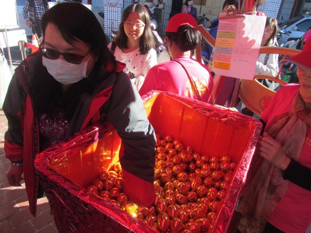紫南宫大年初一发“钱母”,信众兴奋地抽金鸡蛋。(图片来源:台湾《联合报》)