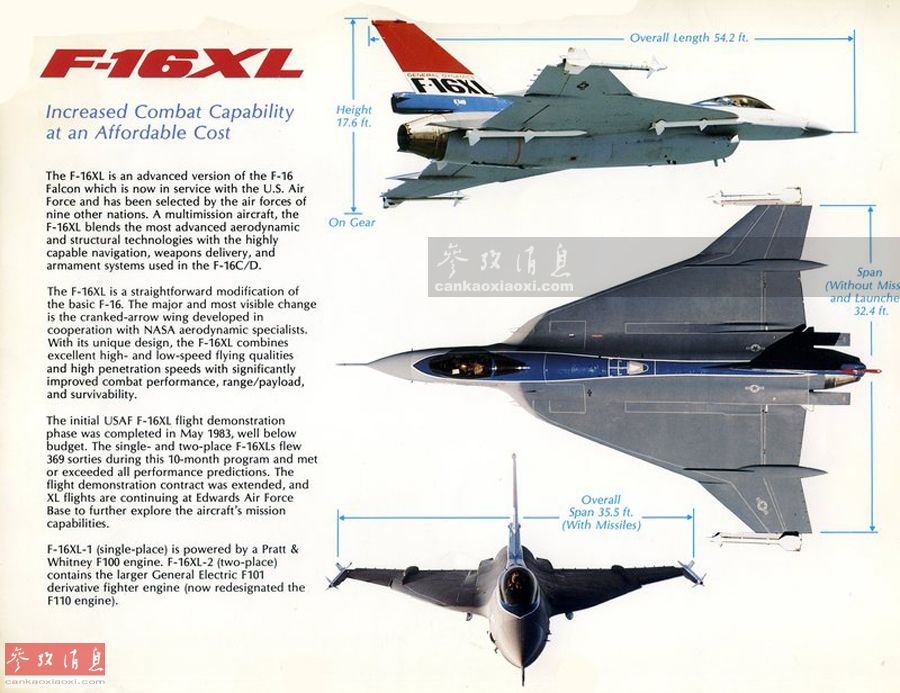 F-16XL全机长16.51米,翼展10.4米,机高5.36米,翼面积达61平方米(比F-16A扩大120%),最大起飞重量21.8吨,搭载一台通用电气F110-GE-100涡扇发动机,最大平飞速度2.05马赫。图为当年的F-16XL 三视图介绍宣传图。