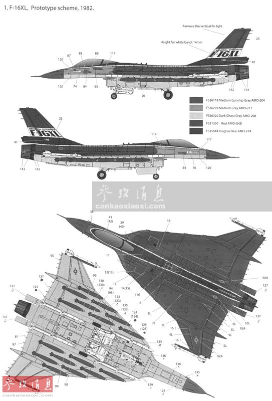 F-16XL原型机于1982年7月成功首飞。该型机选用无尾三角箭形主翼的原因是这种布局能在保持F-16原有高亚因素机动性能的基础上,进一步提升超音速和大迎角机动性能,还能增加油箱容积和载弹量。图为F-16XL的多角度模型绘图。