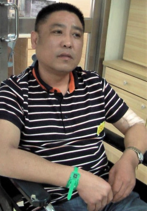 章国海事故发生后被送至高雄市立大同医院急救,坐在轮椅裹伤边打点滴边受访。