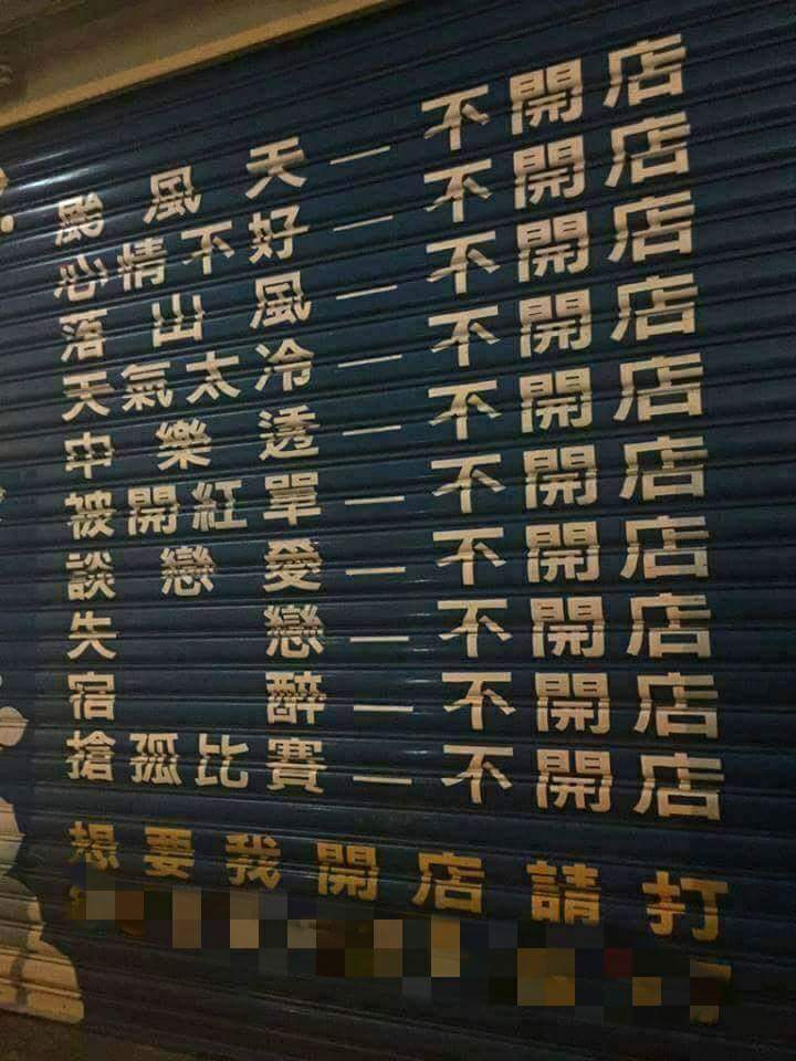 根据网友发表的图片,该店面“飓风天不开店、心情不好不开店、落山风不开店、天气太冷不开店、中乐透不开店、被开红单不开店、太恋爱不开店、失恋不开店、宿醉不开店、抢孤比赛不开店”。