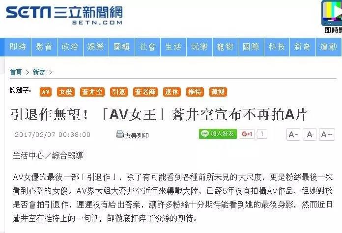 2月7日,台湾“三立新闻网”以“隐退作无望!AV女王苍井空不在拍A片”为标题,报道了苍老师隐退的消息……