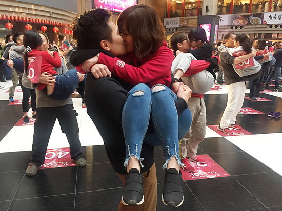 西洋情人节超放闪。微风集团12日提前举办接吻比赛活动,百人参赛激吻,冠军大奖可获得iPhone7外加铁路环岛车票,只见众人都吻到忘我。(“中央社”)