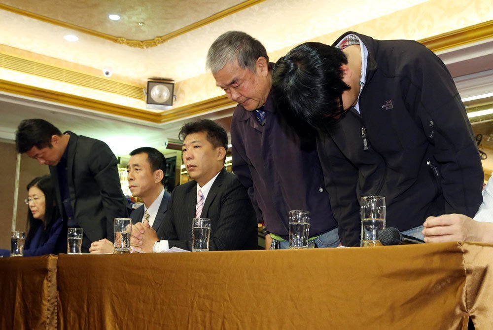 蝶恋花创办人周比苍(右二)及负责人周继弘(右一)父子17日上午首度公开露面道歉,针对康姓司机是否疲劳驾驶,周继弘一度说出“人为财死、鸟为食亡”,引发在场家属众怒。(图片来源:“联合新闻网”)