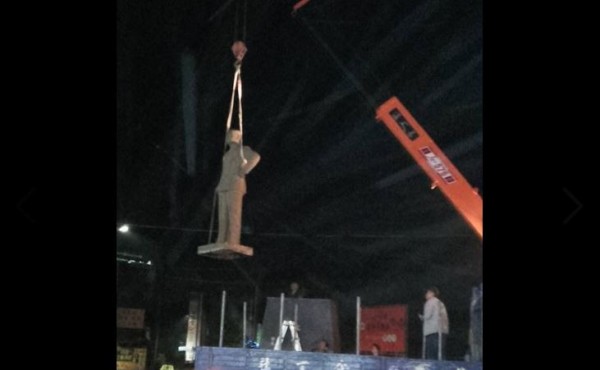 台湾台南市玉井区一座蒋介石铜像21日晚遭到区公所拆除,有网友发现,区公所出动吊车且全程花费约40分钟,将玉井公车站前圆环的蒋介石铜像拆除。