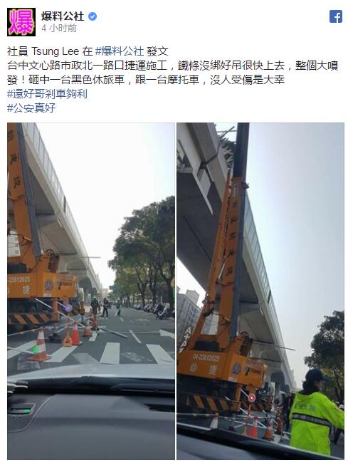 有网友在脸谱社团“爆料公社”上传照片指称,“捷运施工,铁条没绑好吊很快上去,整个大喷发!砸中一台黑色休旅车,跟一台摩托车,没人受伤是大幸。”