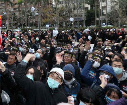 数百名台铁产业工会上月在寒风中抗议,争取依法休假,并把被记旷职复印件丢向交通部。台湾联合报系资料照